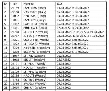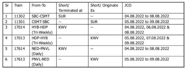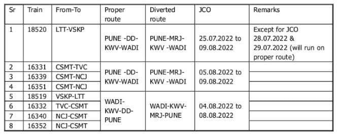 18519 विशाखापट्टनम लोकमान्य तिलक टर्मिनस, 16332 तिरुवनंतपुरम मुम्बई, 16340 नागरकोइल मुम्बई और 16352 नागरकोइल मुम्बई एक्सप्रेस JCO ( अपने प्रारम्भिक स्टेशन से रवाना होने की तिथि ) दिनांक 04 अगस्त से 08 अगस्त तक वाड़ी – कुरडुवाडी – दौंड – पुणे की जगह वाड़ी – कुरडुवाडी – मिरज – पुणे होकर चलेगी।