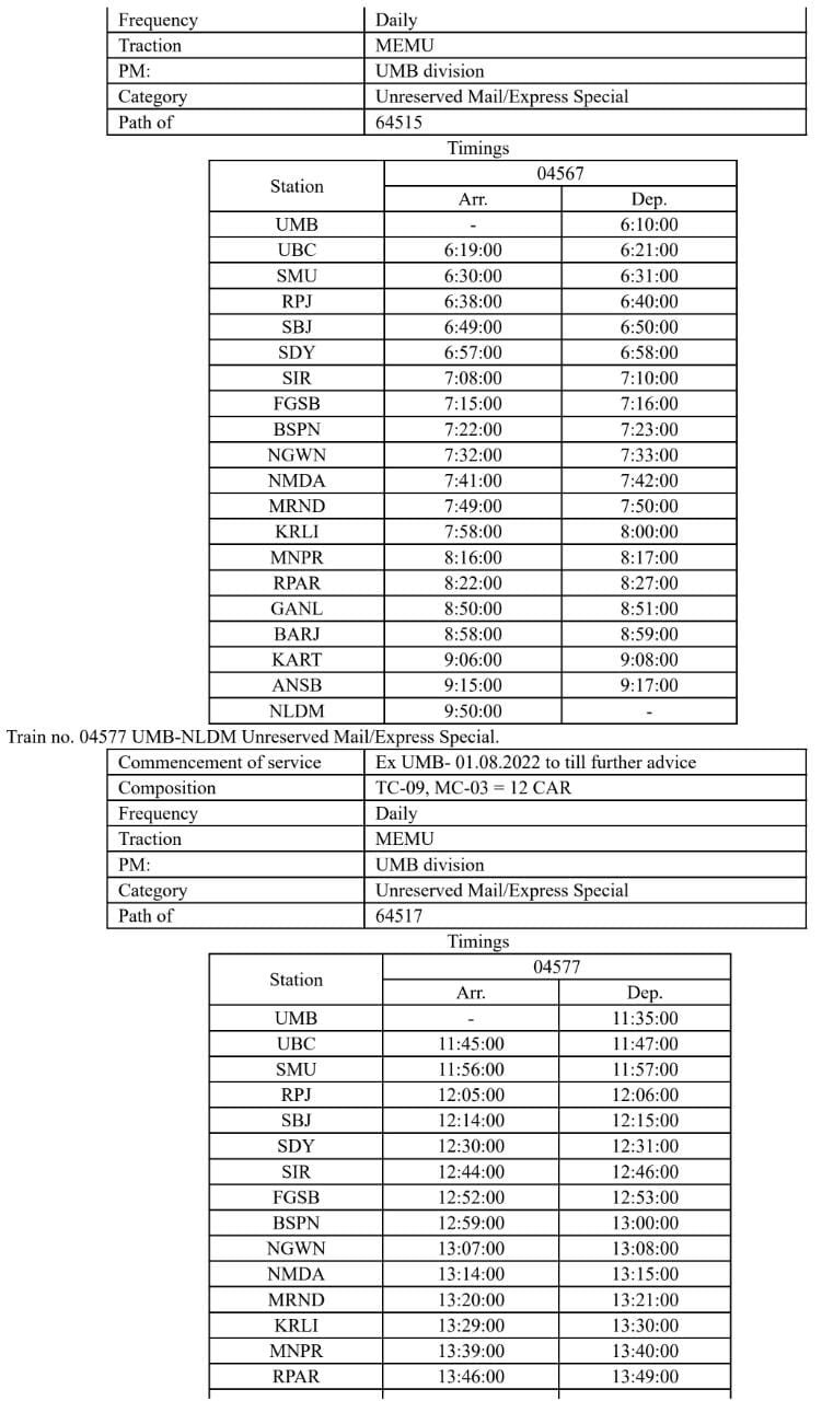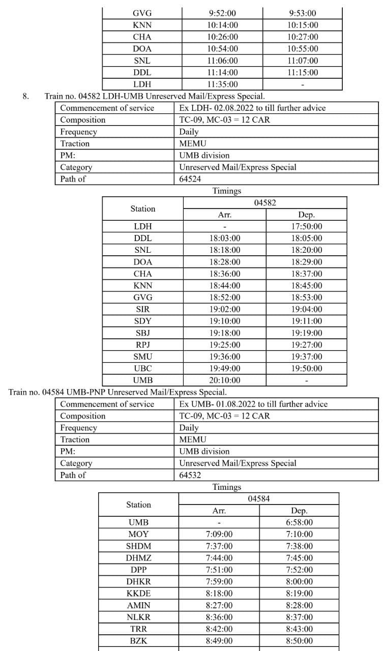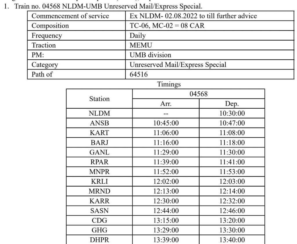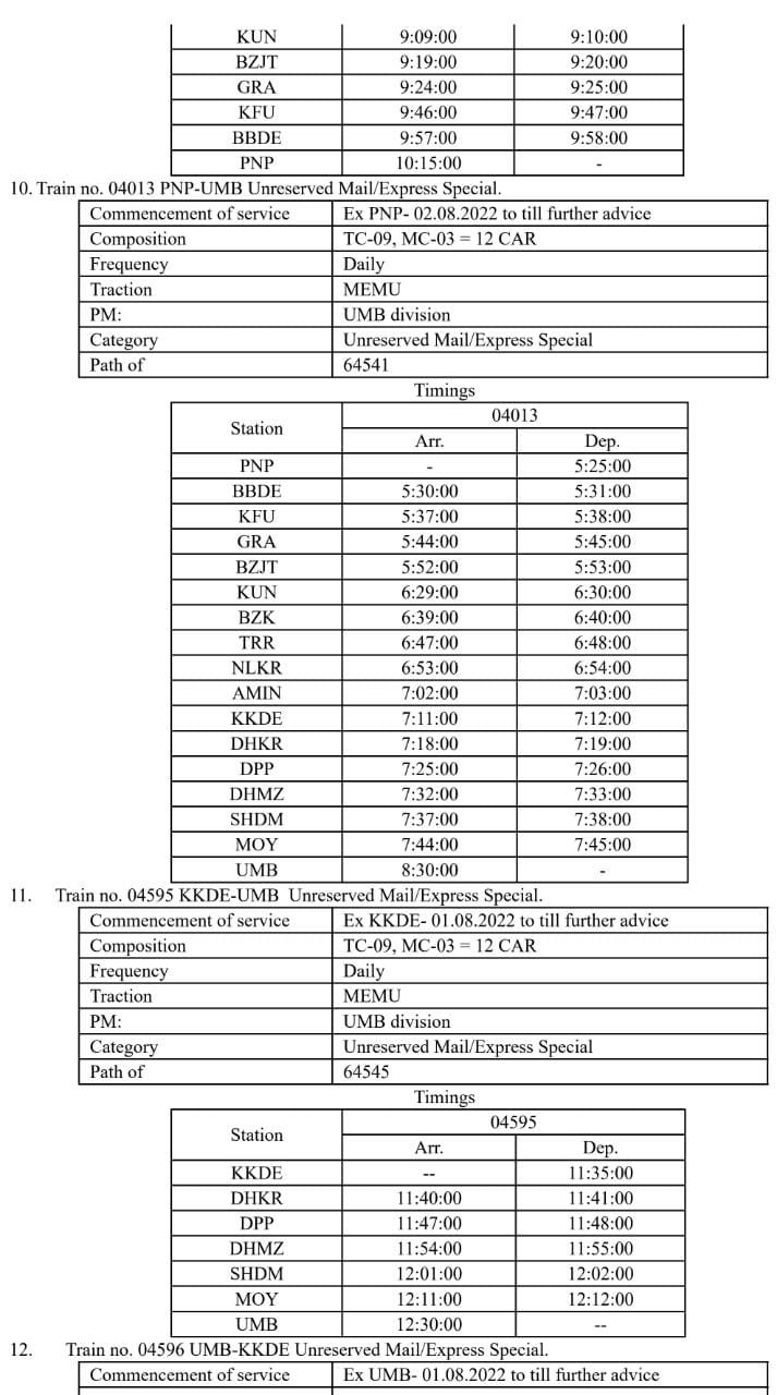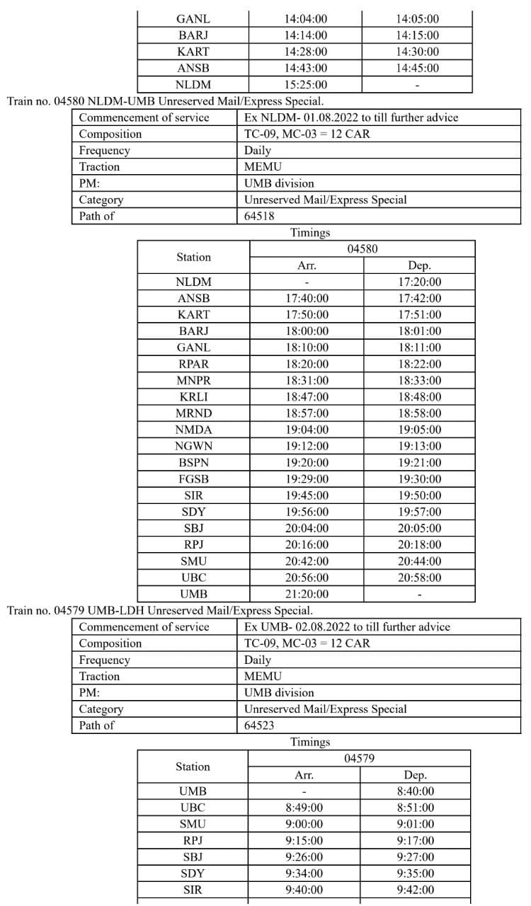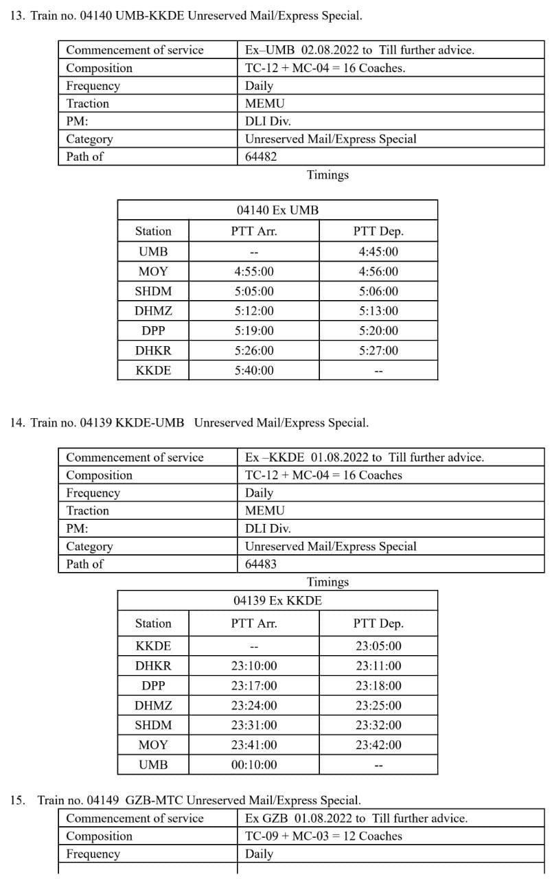 हाल ही में रेल प्रशासन ने जो संक्रमनकाल मे रद्द की हुई गाड़ियोंको पुनर्बहाली करने का जो निर्णय लिया था उसी आधार पर उत्तर रेलवे निम्नलिखित गाड़ियोंको शरू करने जा रहा है।