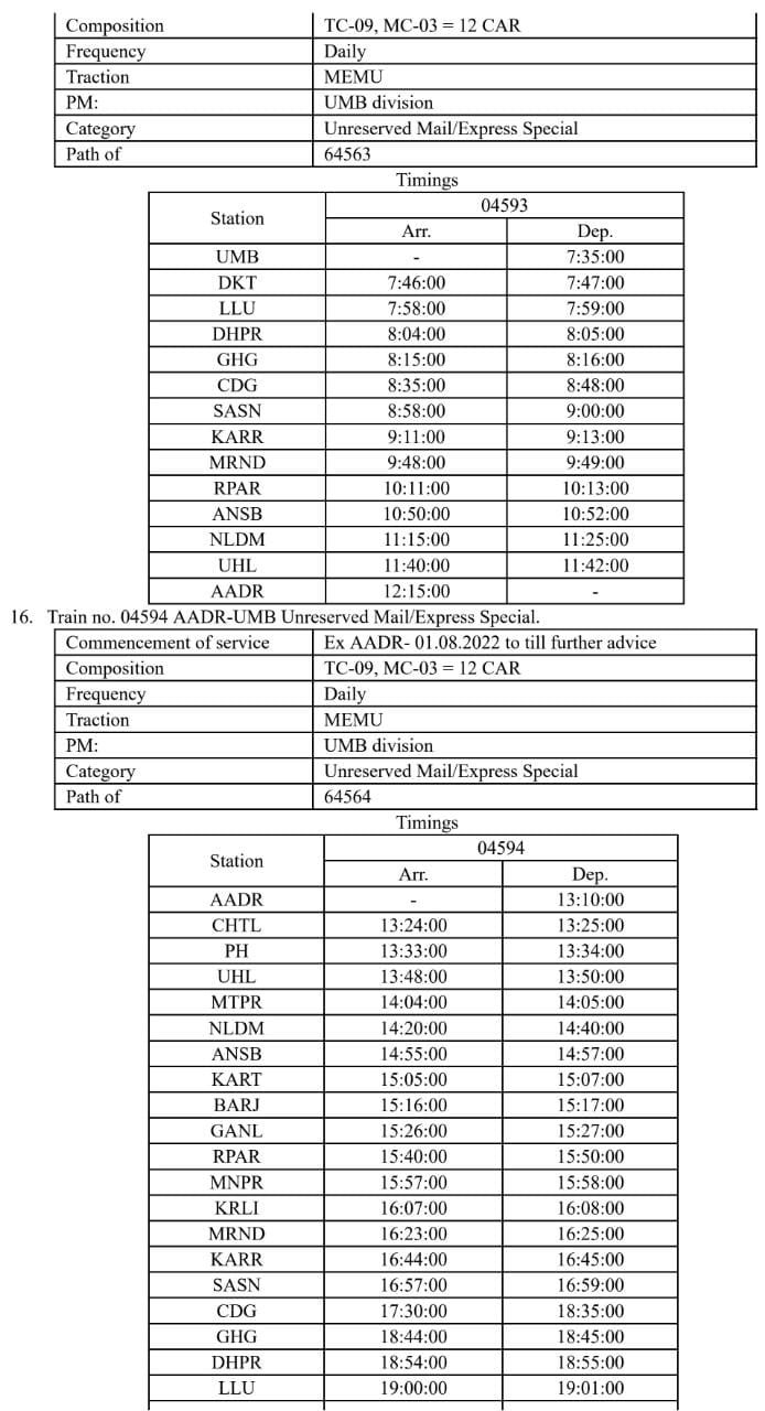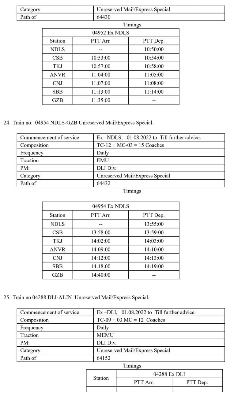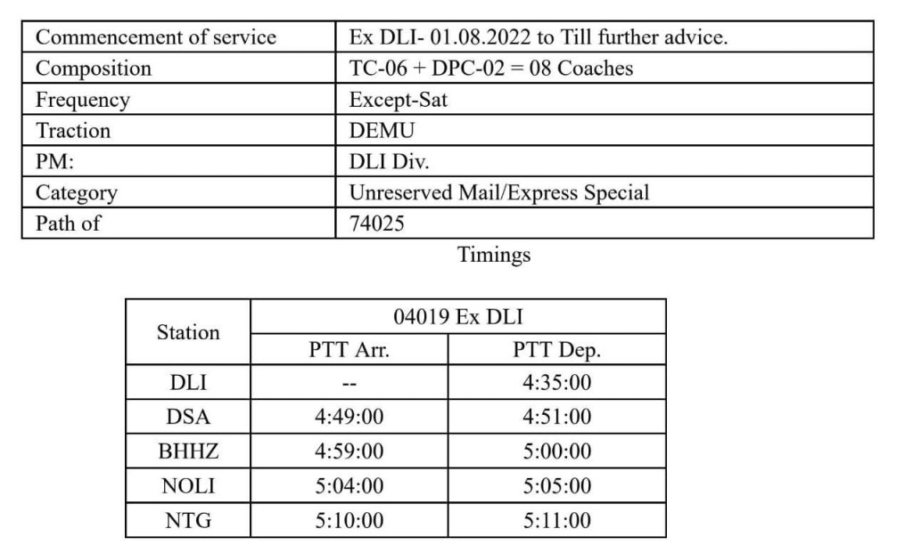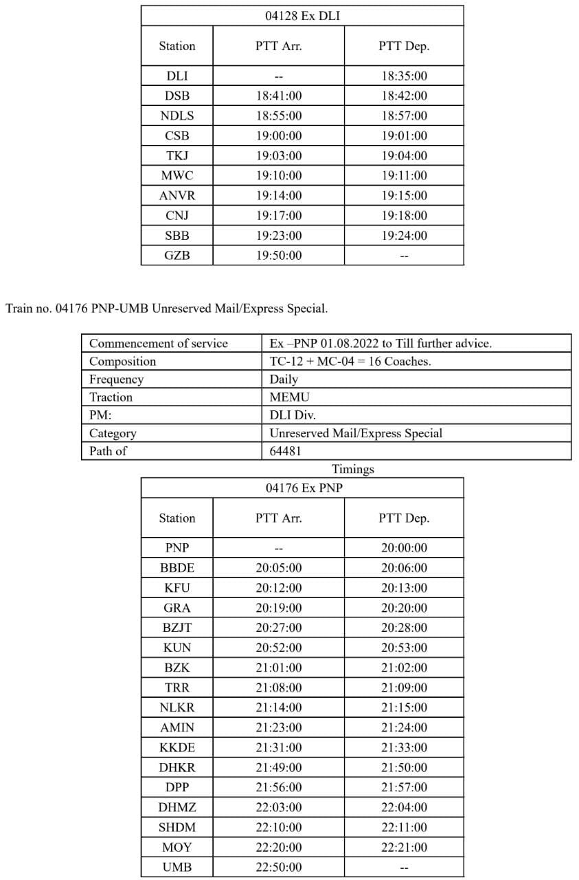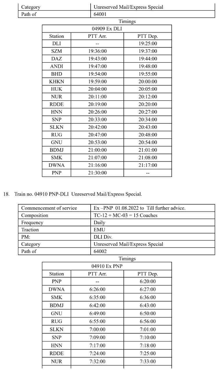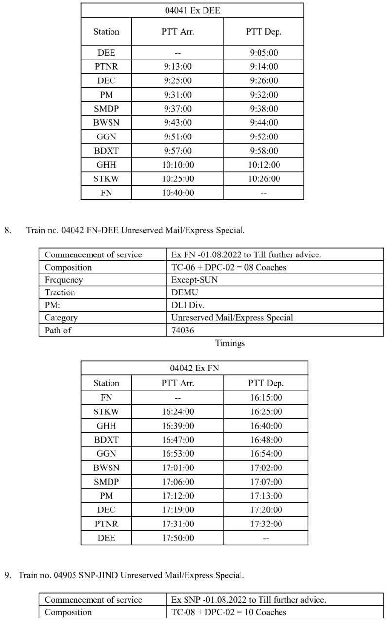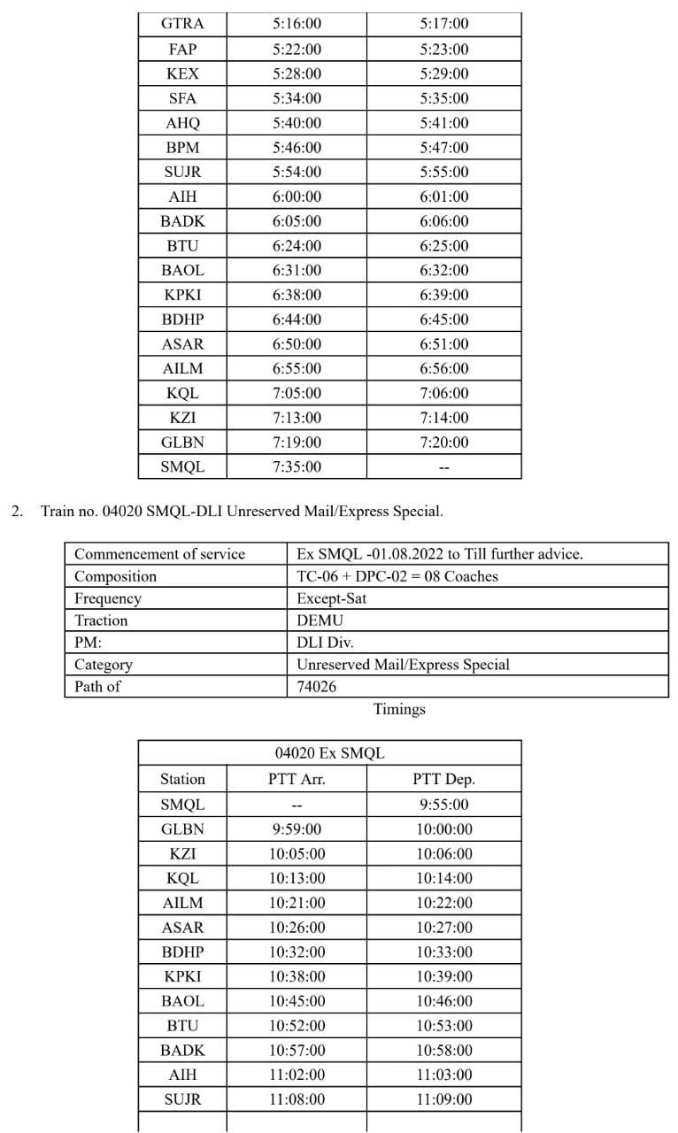 हाल ही में रेल प्रशासन ने जो संक्रमनकाल मे रद्द की हुई गाड़ियोंको पुनर्बहाली करने का जो निर्णय लिया था उसी आधार पर उत्तर रेलवे निम्नलिखित गाड़ियोंको शरू करने जा रहा है।