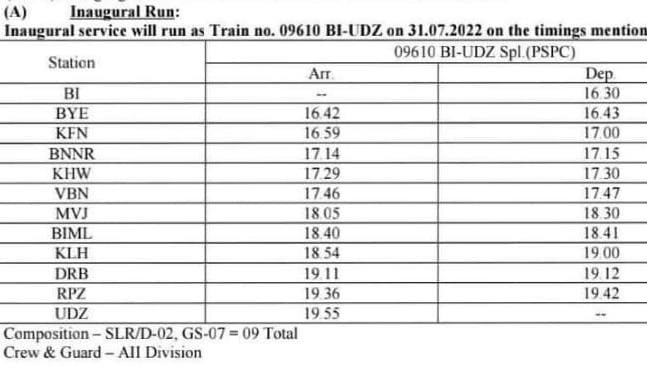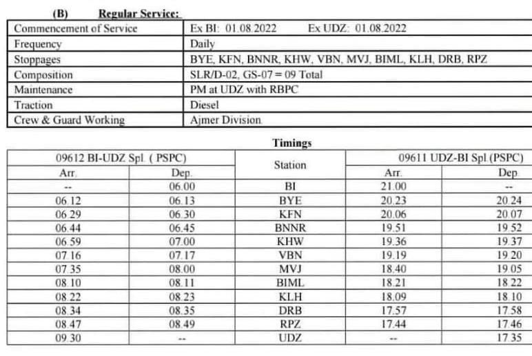 बड़ी सादड़ी और उदयपुर सिटी दोनों ओरसे 01 अगस्त से नियमित सेवा शुरू हो जाएगी। 7 द्वितिय श्रेणी और 2 एसएलआर ऐसे कुल 09 कोच की गाड़ी रहेगी।