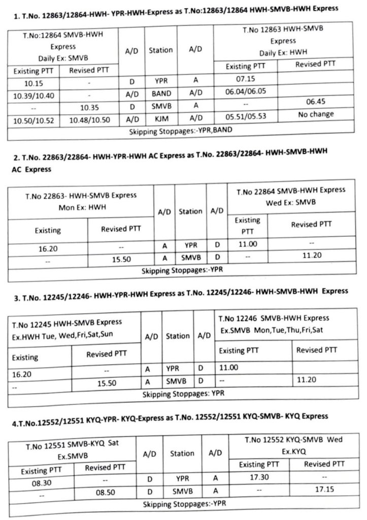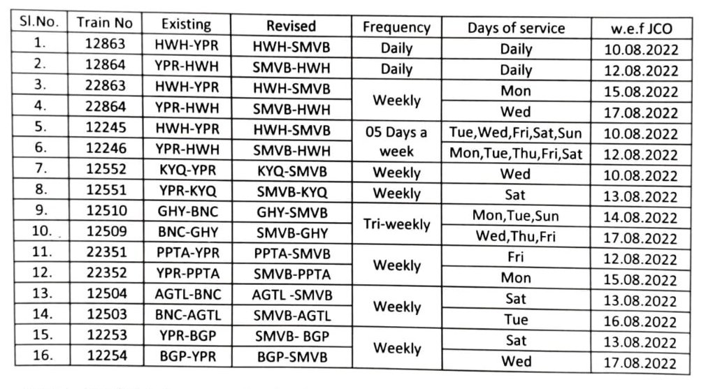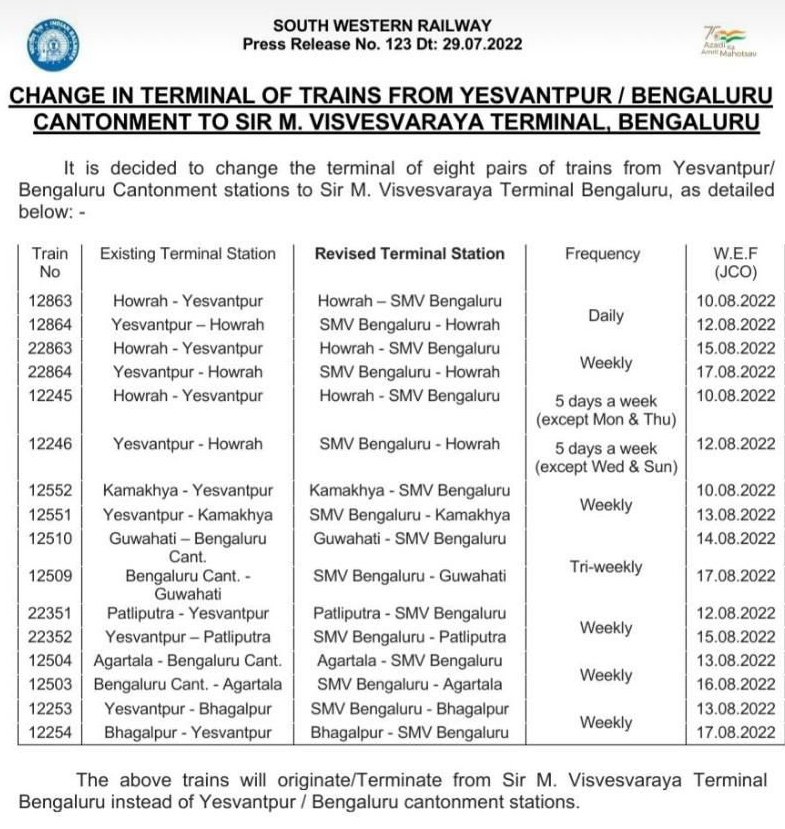 आठ जोड़ी अर्थात 16 गाड़ियाँ अपना बेंगलुरु की दिशा का गन्तव्य / प्रारम्भिक स्टेशन औसतन 10 अगस्त से बदलेंगी। जिसमे यशवंतपुर और बेंगलुरु कैंट स्टेशन की गाड़ियाँ है। JCO याने गाड़ी के प्रारम्भिक स्टेशन से चलने की तिथि के लिए निम्नलिखित परिपत्रक देखें।