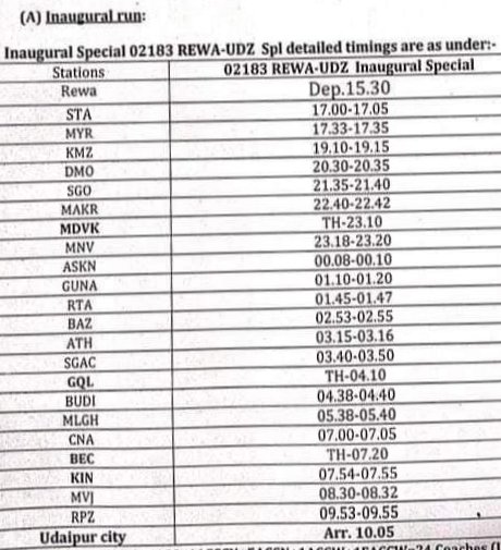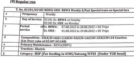 गौरतलब यह है, उपरोक्त उदयपुर सिटी साप्ताहिक विशेष गाड़ी 02188/87 रीवा मुम्बई छत्रपति शिवाजी महाराज टर्मिनस रीवा साप्ताहिक विशेष के रैक के लाय ओवर पीरियड अर्थात रैक के खाली समय पड़े रहने के अवधि में चलाई जा रही है।