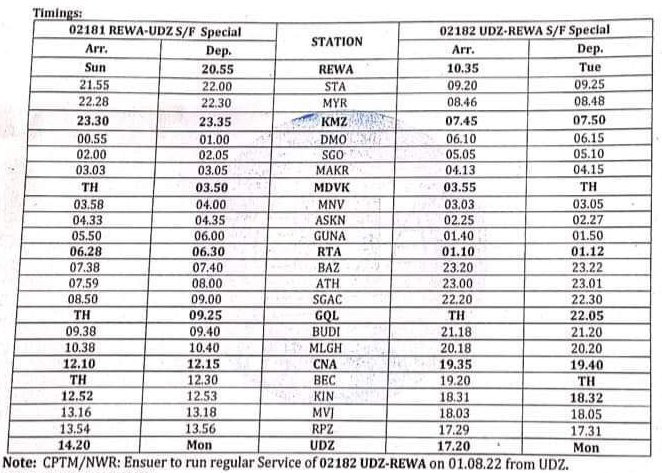 02181 रीवा उदयपुर सिटी साप्ताहिक विशेष दिनांक 07 अगस्त से 28 अगस्त तक प्रत्येक रविवार को रीवा से निकल अगले दिन सोमवार को उदयपुर सिटी को पहुंचेगी। वापसीमे 02182 उदयपुर सिटी रीवा साप्ताहिक विशेष दिनांक 08 अगस्त से 29 अगस्त तक प्रत्येक सोमवार को उदयपुर सिटी से निकल अगले दिन मंगलवार को रीवा पहुंचेगी।