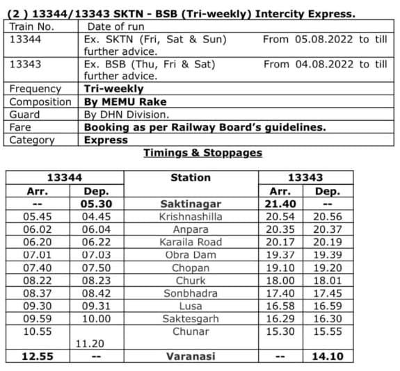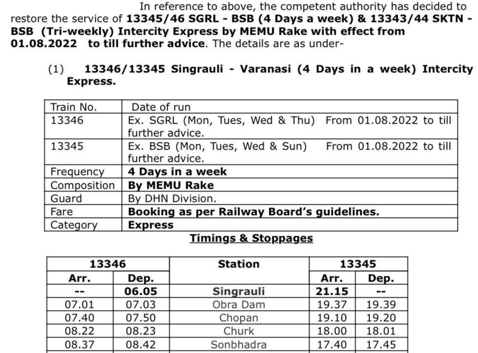 13345/46 सिंगरौली वाराणसी सिंगरौली प्रतिदिन इन्टरसिटी और उसकी 23345/46 शक्तिनगर वाराणसी शक्तिनगर प्रतिदिन लिंक एक्सप्रेस अब दो विभक्त गाड़ियाँ कर दी गयी है। 13345/46 सिंगरौली एक्सप्रेस सप्ताह में 4 दिवसीय औऱ 13343/44 शक्तिनगर एक्सप्रेस सप्ताह में तीन दिवसीय बनकर चलेगी।