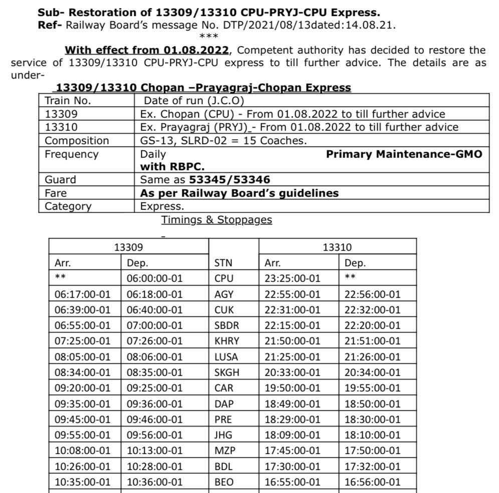 संक्रमनपूर्व 53345/46 चोपन प्रयागराज चोपन सवारी गाड़ी को एक्सप्रेस के रूप में, 13309/10 गाड़ी क्रमांक से पुनर्बहाल किया जा रहा है।