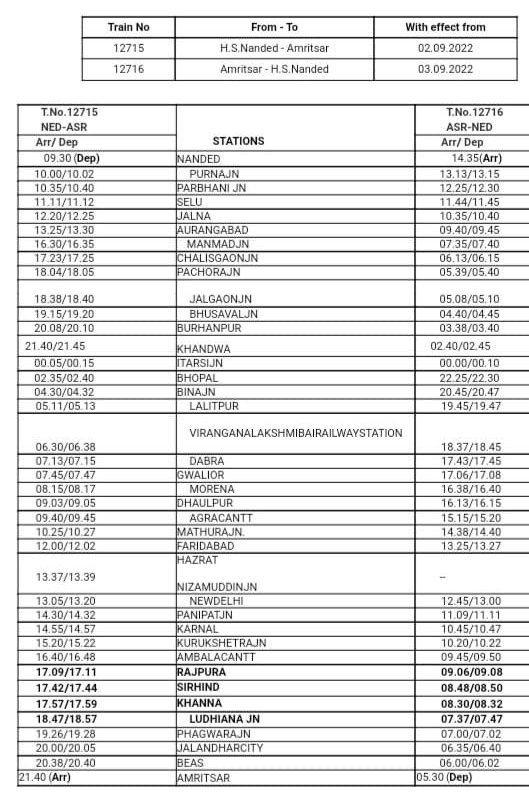 12715 नान्देड़ अमृतसर सचखण्ड एक्सप्रेस का 02 सितम्बर से और 12716 अमृतसर नान्देड़ सचखण्ड एक्सप्रेस का कल दिनांक 03 सितम्बर से मार्ग परिवर्तन हो रहा है। यह गाड़ियाँ अब निम्नलिखित टाइमटेबल के अनुसार चंडीगढ़ स्टेशन के बजाय, अम्बाला, राजपुरा सरहिन्द होकर चलेगी।