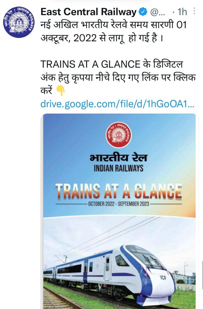 नई अखिल भारतीय रेलवे समय सारणी 01 अक्टूबर, 2022 से लागू हो गई है ।