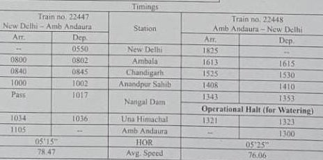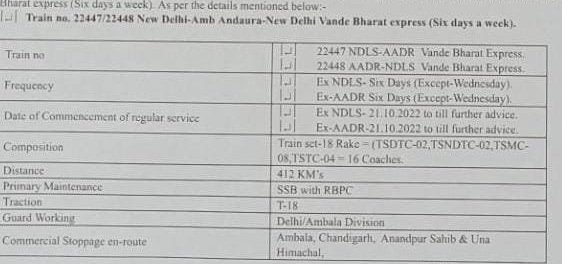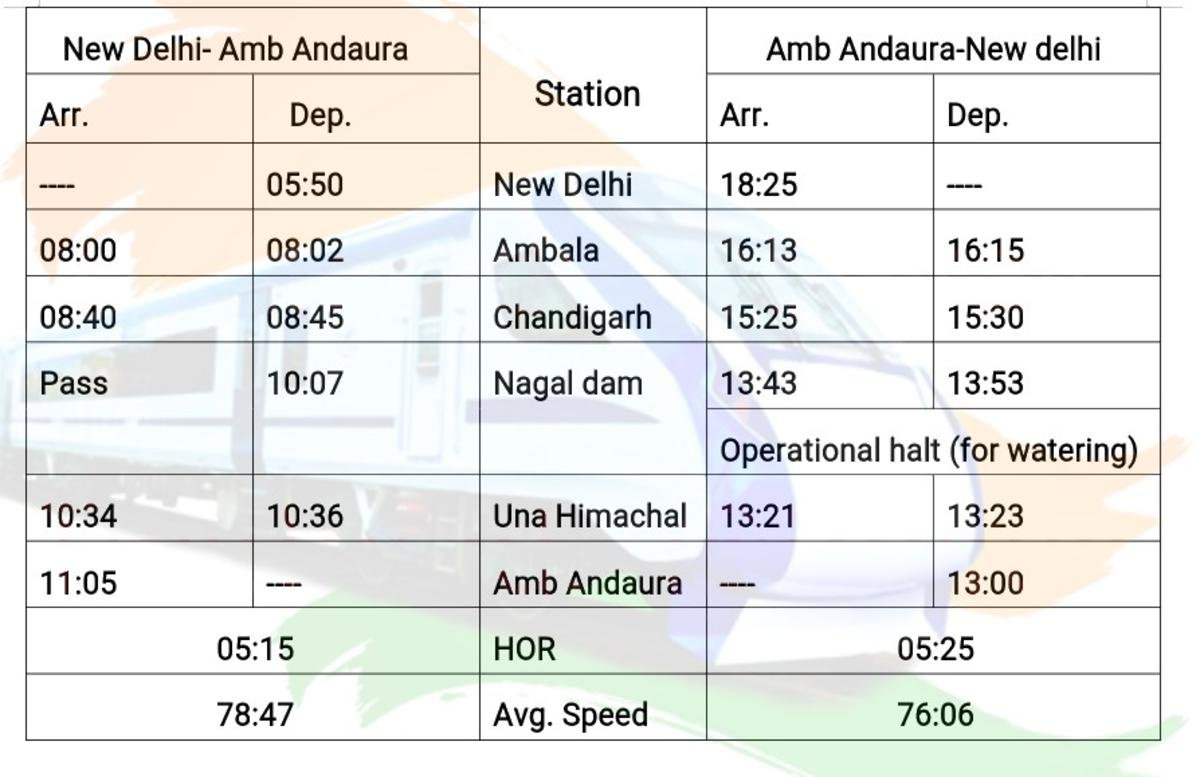 22447 नई दिल्ली – अम्ब अन्दौरा वन्देभारत एक्सप्रेस और 22448 – अम्ब अन्दौरा – नई दिल्ली वन्देभारत एक्सप्रेस। दोनोंही दिशाओंसे यह गाड़ियाँ, सप्ताह में 6 दिन चलेंगी, ( प्रत्येक बुधवार को छोड़कर ) दिनांक 21 अक्टूबर से अपना पहला नियमित फेरा शुरू करेगी। कृपया निम्नलिखित समयसारणी देखिए,