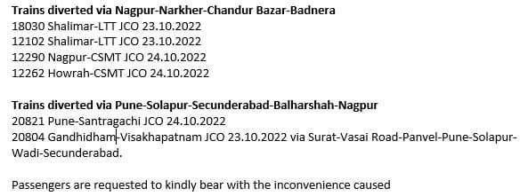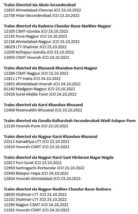 भुसावल – नागपुर मार्ग पर बडनेरा के पास मालखेड़, टिमटाला के बीच मालगाड़ी के लगभग 30 डिब्बे बेपटरी हो गए। दोनोंही रेल मार्ग अवरुद्ध है और उन्हें फिर सुव्यवस्थित करने का काम युद्ध स्तर पर किया जा रहा है। पहले ही इस मार्ग की कई यात्री गाड़ियाँ 16 दिन का सोलापुर मण्डल के दोहरीकरण वाले रेल ब्लॉक और दपुमरे के रेल तिहरीकरण वाले रेल ब्लॉकों से बेहाल थी और उसमे यह मालगाड़ी का बेपटरी होना फिर इस मार्ग की यात्री गाड़ियोंकी समयसारणी को बदहाल कर देगा। खैर, रेल यात्रिओंके लिए परिपत्रक जारी किये जा रहे जो मार्ग की हालिया स्थिति बताएंगे।