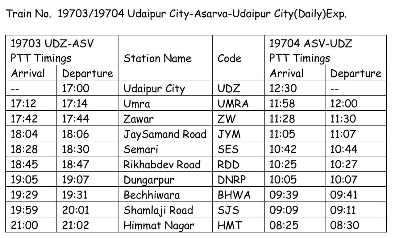 19703/04 उदयपुर सिटी आसरवा उदयपुर सिटी एक्सप्रेस दिनांक 01 नवम्बर से प्रतिदिन