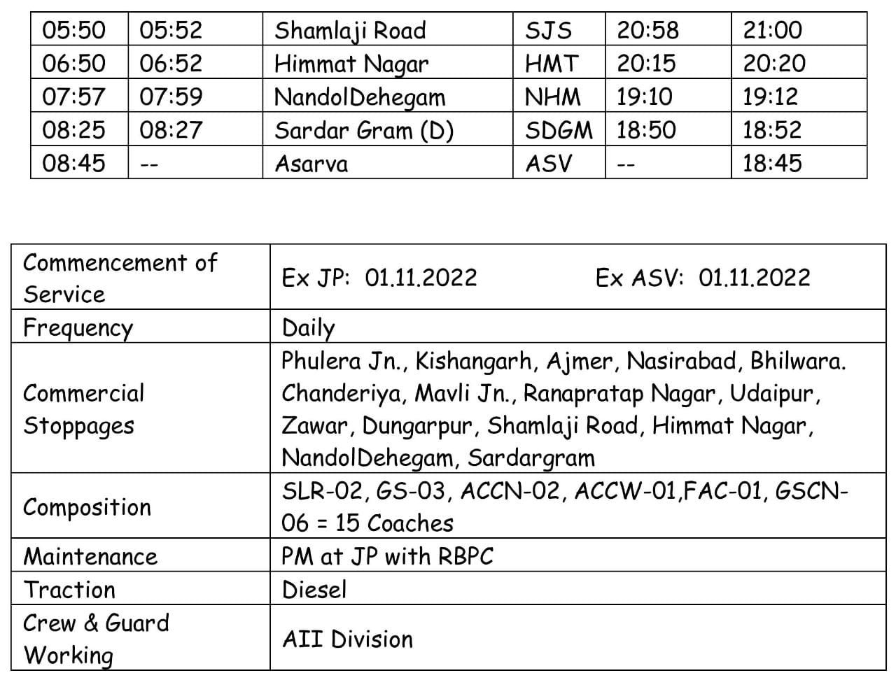 12981/82 जयपुर आसरवा जयपुर सुपरफास्ट एक्सप्रेस दिनांक 01 नवम्बर से प्रतिदिन