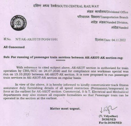 निम्नलिखित परिपत्रक दमरे मुख्यालय से जारी हुवा यह दर्शाता है, इस मार्ग से सम्बंधित सभी कार्यालयों को यह सूचना दी गयी है की उक्त मार्ग का सुरक्षा परीक्षण हो चुका है और हालिया स्थिती का आकलन कर जल्द से जल्द मुख्यालय को उत्तर दिया जाए ताकि इस मार्ग पर यात्री सेवा शुरू की जाए। यह आकोटवासियोंके लम्बे संघर्ष का प्रतिफल है और क्षेत्र के सभी यात्रिओंके लिए अच्छी खबर!