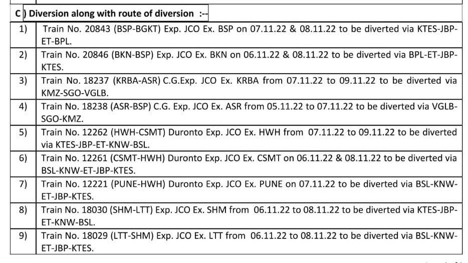 18030 शालीमार लोकमान्य तिलक टर्मिनस एक्सप्रेस JCO दिनांक 06, 07 एव 08 को बिलासपुरसे मार्ग परिवर्तन कर कटनी साऊथ, जबलपुर, इटारसी, खण्डवा होकर भुसावल आएगी और आगे अपने नियमित मार्ग से मुम्बई की ओर चलेगी। वापसीमे 18029 लोकमान्य तिलक टर्मिनस शालीमार एक्सप्रेस JCO दिनांक 06, 07 एव 08 को भुसावल से मार्ग परिवर्तन कर खण्डवा, इटारसी, जबलपुर कटनी होकर बिलासपुर से आगे नियमित मार्ग से हावडा की ओर चलेगी।
