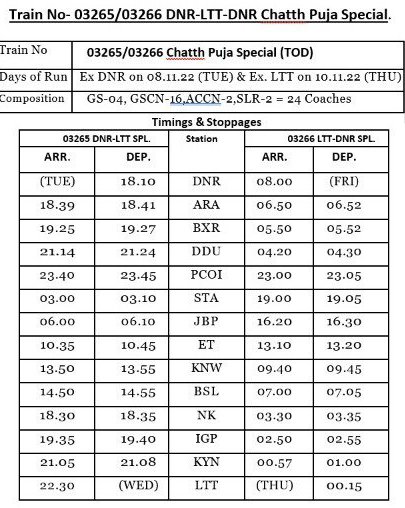 03265 दानापुर लोकमान्य तिलक टर्मिनस विशेष दिनांक 08 और 03266 लोकमान्य तिलक टर्मिनस दानापुर दिनांक 10 नवम्बर को चलेगी। गाड़ी की संरचना में 02 एसएलआर, 04 जनरल, 16 स्लीपर और 2 वातानुकूल थ्री टियर रहेंगे। यह भी गाड़ी TOD है, अतः यात्री किराया नियमित किराया दरोंसे 1.3 गुना ज्यादा रहेगा।
