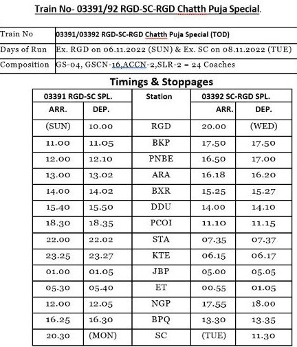 03391 राजगीर सिकंदराबाद विशेष दिनांक 06/11/22 को और 03392 सिकंदराबाद राजगीर विशेष दिनांक 08 नवम्बर को चलेगी। गाड़ी की संरचना में 02 एसएलआर, 04 जनरल, 16 स्लीपर और 2 वातानुकूल थ्री टियर रहेंगे। यह भी गाड़ी TOD है, अतः यात्री किराया नियमित किराया दरोंसे 1.3 गुना ज्यादा रहेगा।
