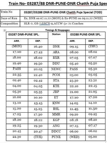 03287 दानापुर पुणे विशेष दिनांक 07 और 03287 पुणे दानापुर विशेष दिनांक 09 नवम्बर को चलेगी। गाड़ी की संरचना में 2 एसएलआर, 7 जनरल, 9 स्लीपर और 3 वातानुकूल थ्री टियर रहेंगे। गाड़ी TOD है, अतः यात्री किराया नियमित किराया दरोंसे 1.3 गुना ज्यादा रहेगा।