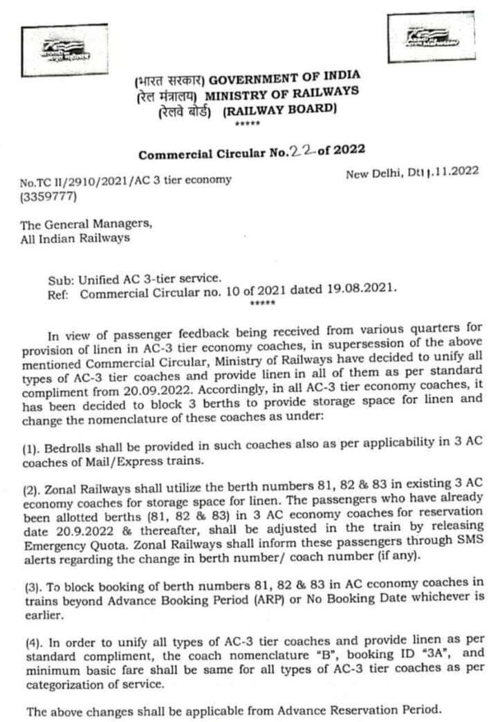 आप निम्नलिखित परिपत्र देख लीजिए। हाँ, अब आपने वातानुकूल थ्री टियर में आरक्षण करवाया है तो आपकी तक़दीर की नियमित कोच रहेगा या इकोनॉमी! ☺️☺️ वैसे यह भी तय समझिए, आगे सारे वातानुकूल थ्री टियर कोच “इकोनॉमी” ही निर्माण किये जा रहे है।