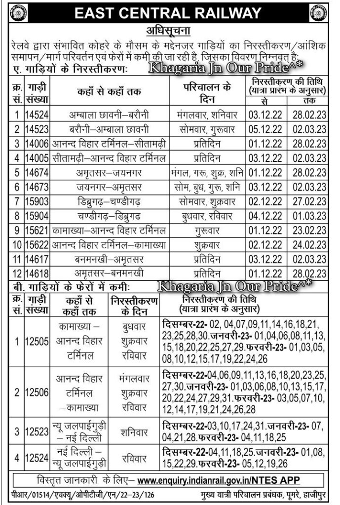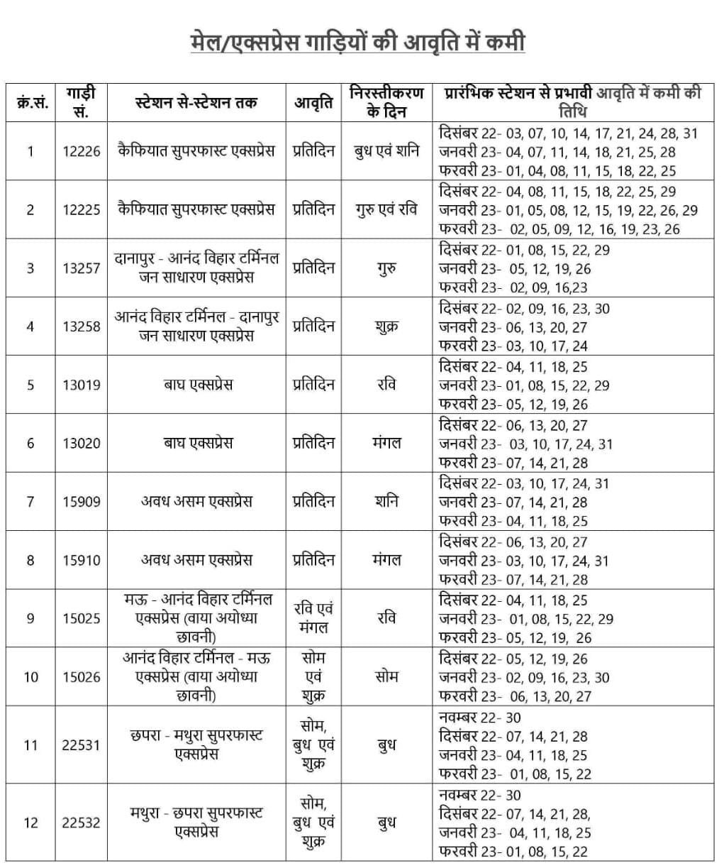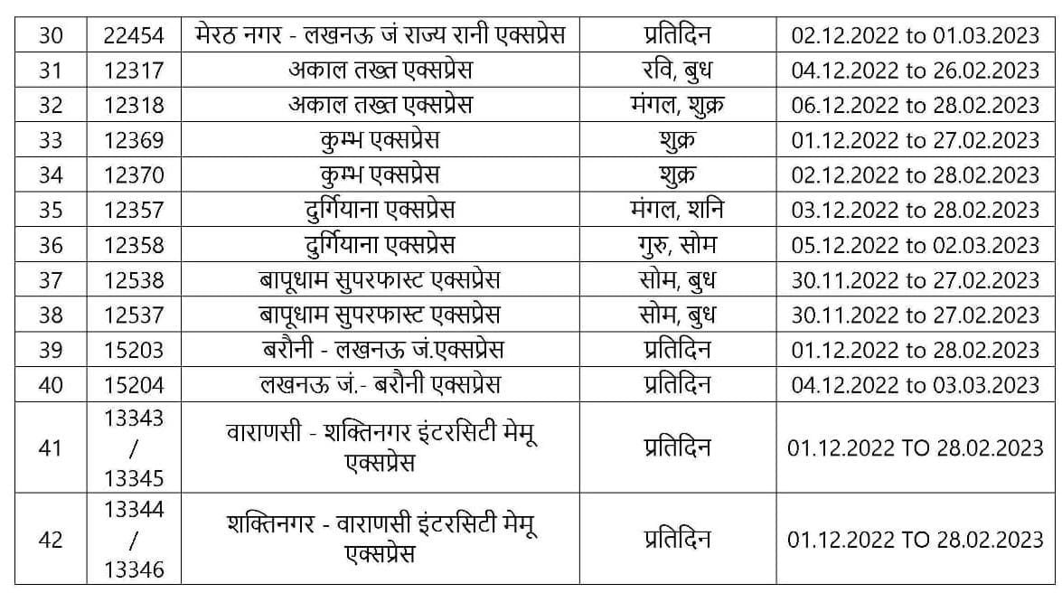 उत्तरी क्षेत्र में आने वाले 3 महीने निम्नलिखित गाड़ियोंका परिचालन समझ लीजिए।