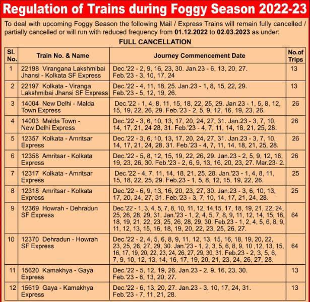 फेरों में कमी या आंशिक रद्द की गई गाड़ियाँ