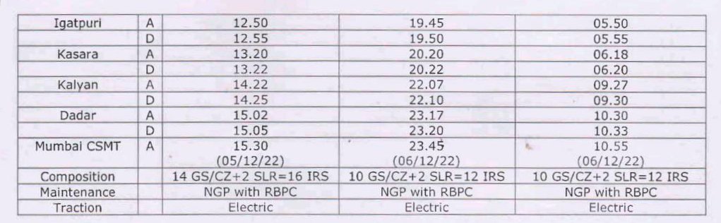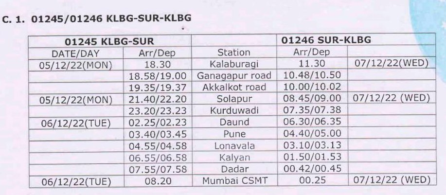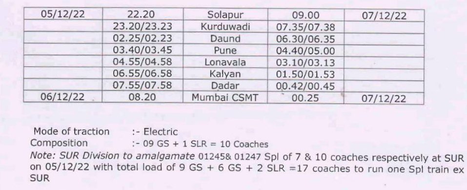 01247 सोलापुर मुम्बई विशेष दिनांक 05 दिसम्बर को चलेगी वापसीमे 01248 मुम्बई सोलापुर विशेष दिनांक 07 दिसम्बरको निकलेगी।