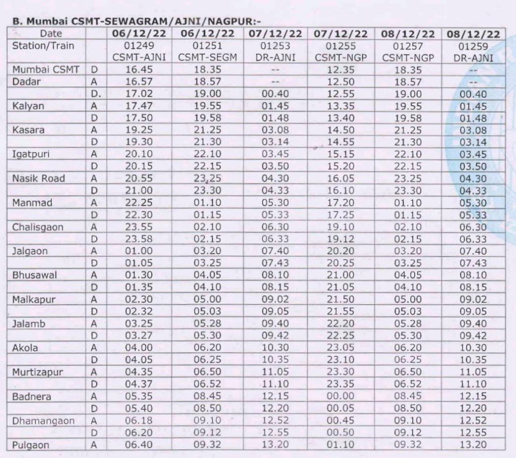 दिनांक 04 एवं 05 दिसम्बर को नागपुर से मुम्बई के लिए 3 विशेष गाड़ियाँ