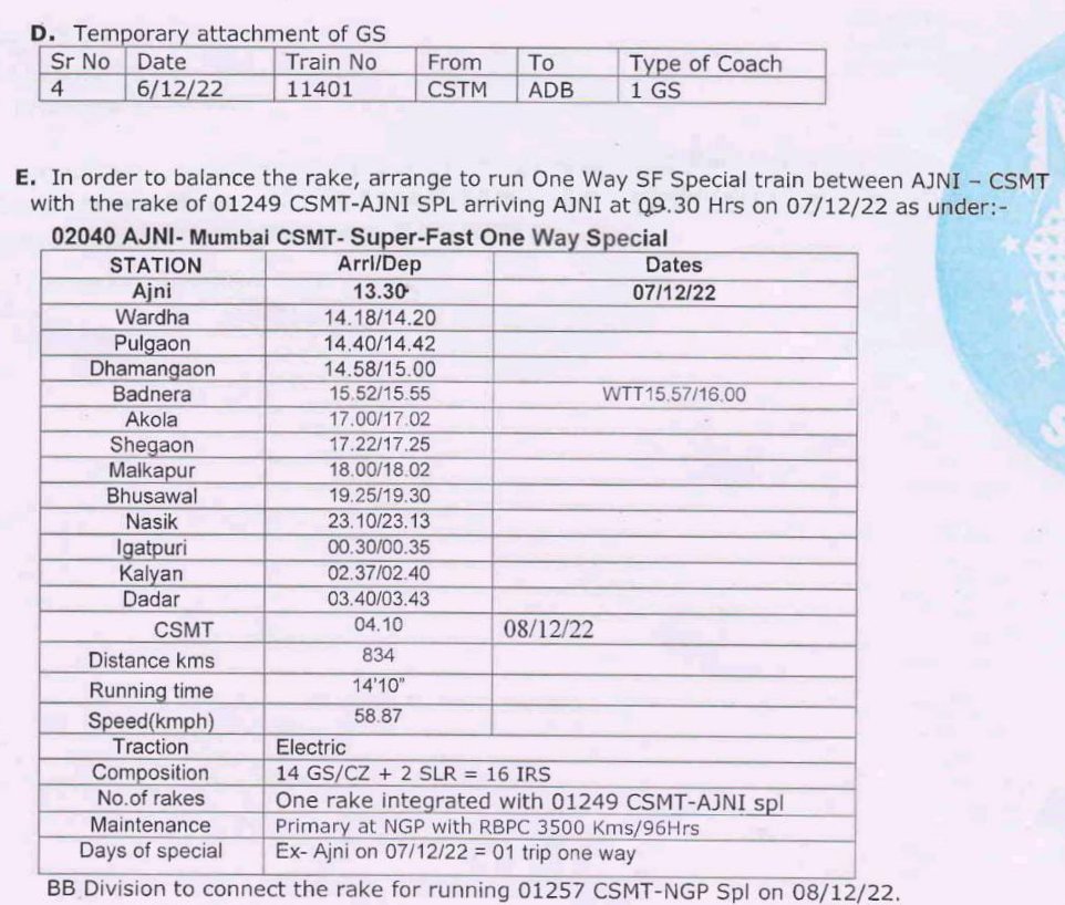 दिनांक 07 दिसम्बर को अजनी से मुम्बई के लिए एकतरफा सुपरफास्ट विशेष 02040 चलाई जायगी।