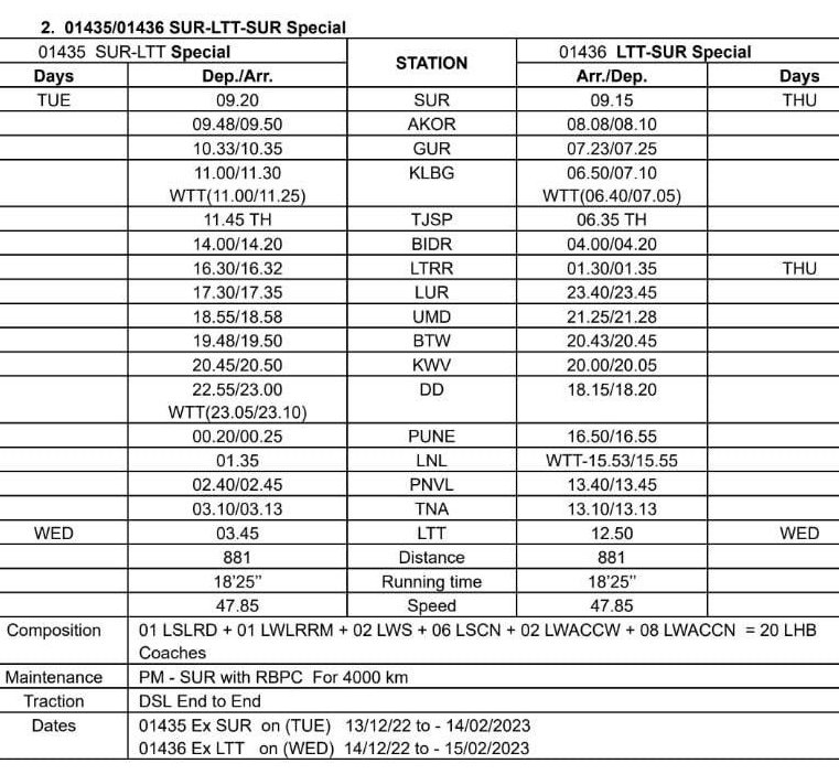 01435 सोलापुर लोकमान्य तिलक टर्मिनस साप्ताहिक विशेष दिनांक 13 दिसम्बर से 14 फ़रवरी तक प्रत्येक मंगलवार को और 01436 लोकमान्य तिलक टर्मिनस सोलापुर साप्ताहिक विशेष दिनांक 14 दिसम्बर से 15 फ़रवरी तक प्रत्येक बुधवार को चलेगी। गाड़ी संरचना में 1 एसएलआर, 02 द्वितीय श्रेणी अनारक्षित, 06 स्लीपर, 02 वातानुकूल 2 टियर, 08 वातानुकूल 3 टियर कुल 20 LHB कोच रहेंगे।