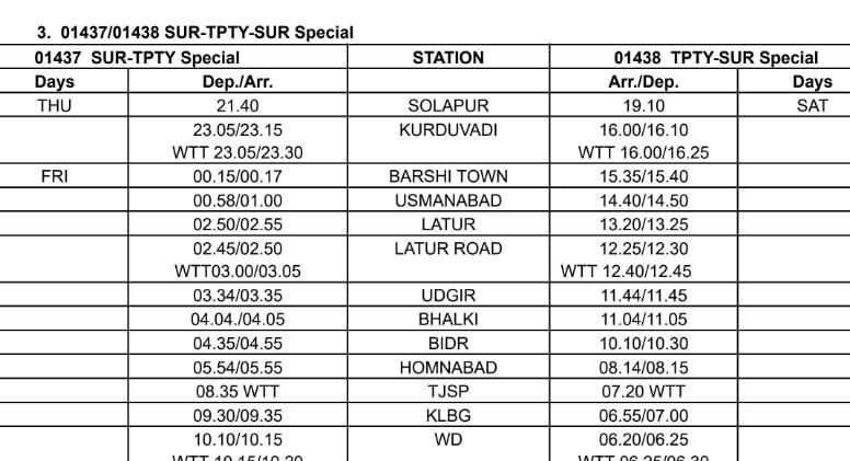 01437 सोलापुर तिरुपति साप्ताहिक विशेष दिनांक 15 दिसम्बर से 16 फ़रवरी तक प्रत्येक गुरुवार को और 01438 तिरुपति सोलापुर साप्ताहिक विशेष दिनांक 16 दिसम्बर से 17 फ़रवरी तक प्रत्येक शुक्रवार को चलेगी। गाड़ी संरचना में 1 एसएलआर, 02 द्वितीय श्रेणी अनारक्षित, 06 स्लीपर, 02 वातानुकूल 2 टियर, 08 वातानुकूल 3 टियर कुल 20 LHB कोच रहेंगे।