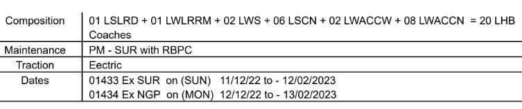 01433 सोलापुर नागपुर साप्ताहिक विशेष दिनांक 11 दिसम्बर से 12 फ़रवरी तक प्रत्येक रविवार को और 01434 नागपुर सोलापुर साप्ताहिक विशेष दिनांक 12 दिसम्बर से 13 फ़रवरी तक प्रत्येक सोमवार को चलेगी। गाड़ी संरचना में 1 एसएलआर, 02 द्वितीय श्रेणी अनारक्षित, 06 स्लीपर, 02 वातानुकूल 2 टियर, 08 वातानुकूल 3 टियर कुल 20 LHB कोच रहेंगे।