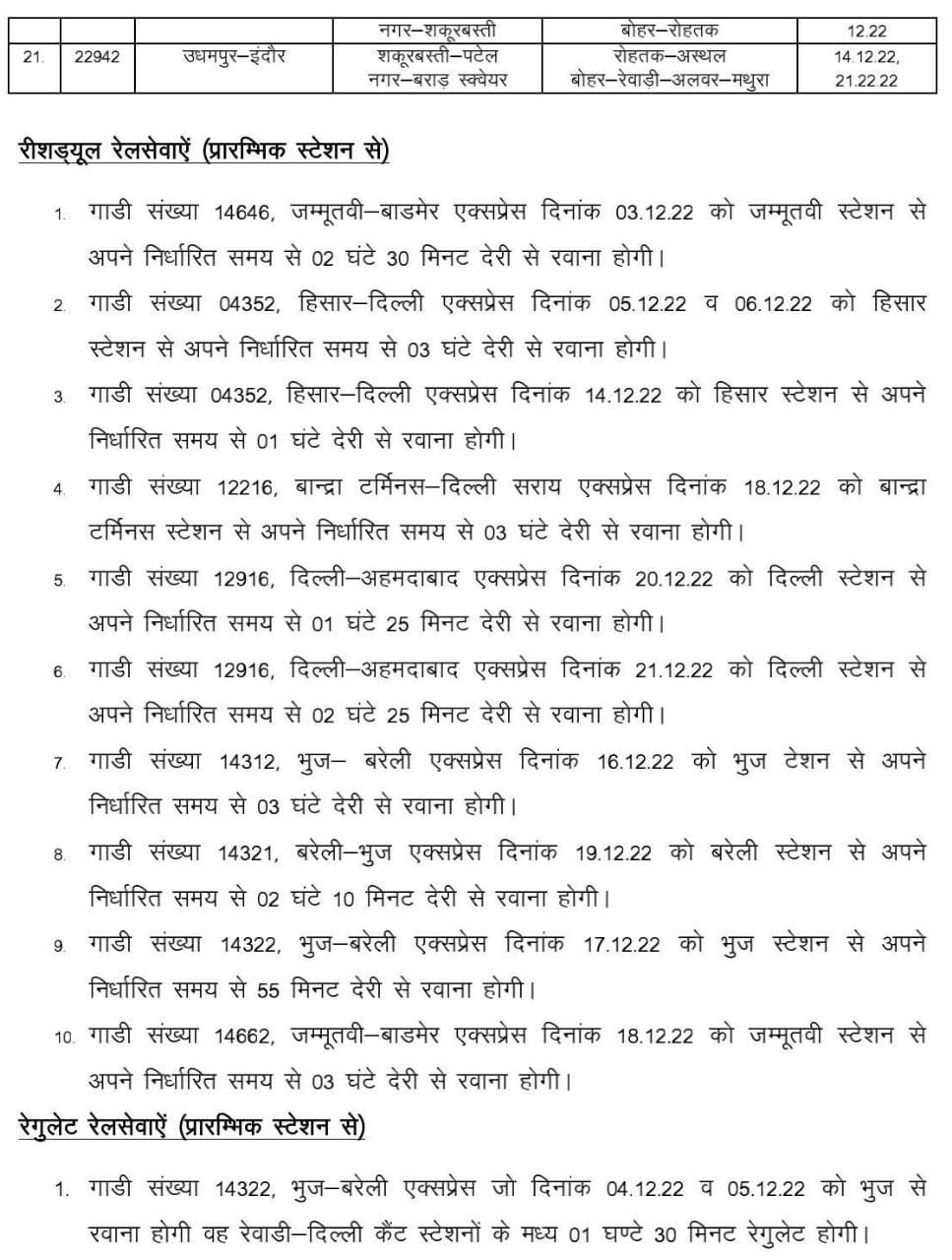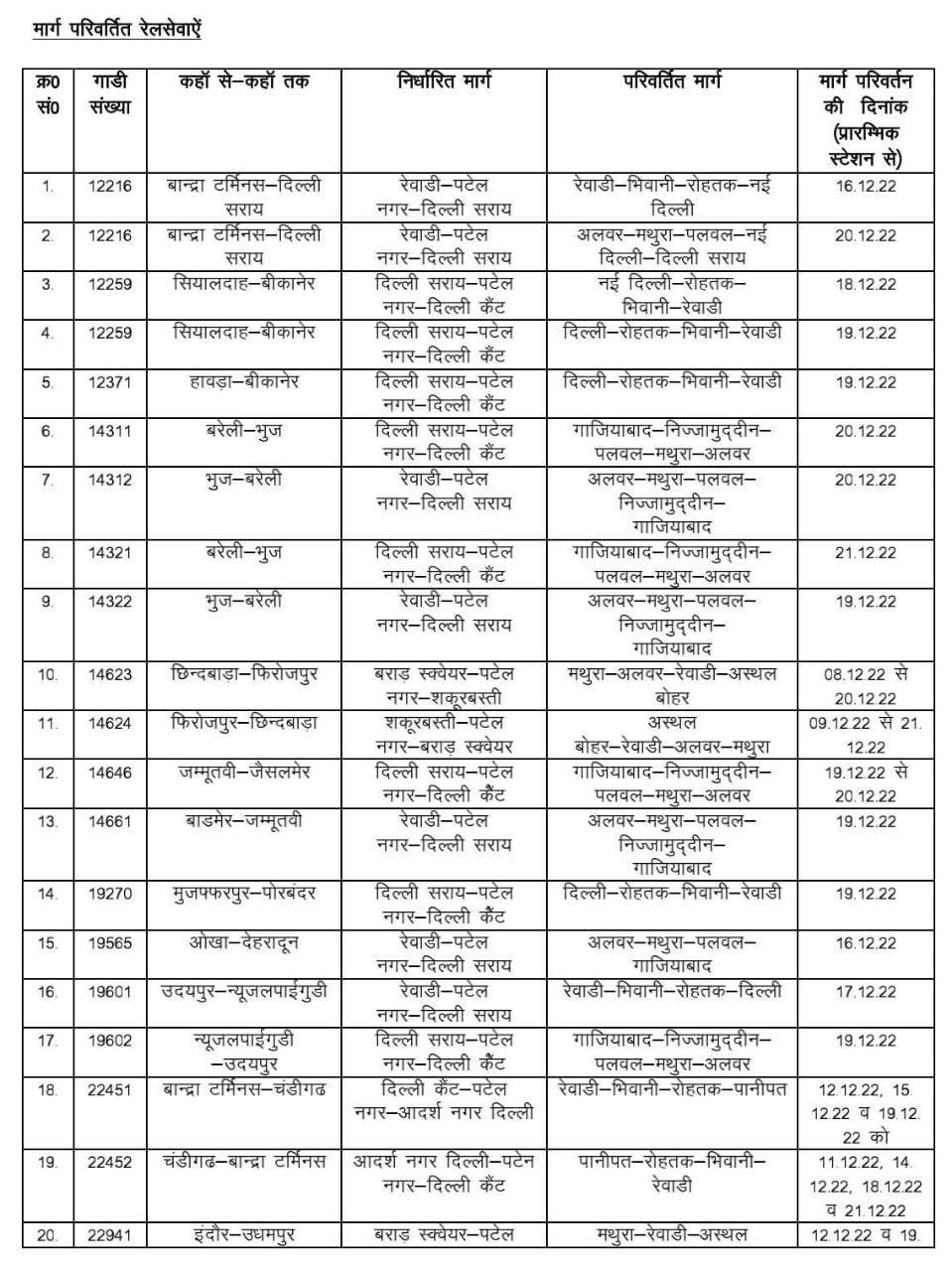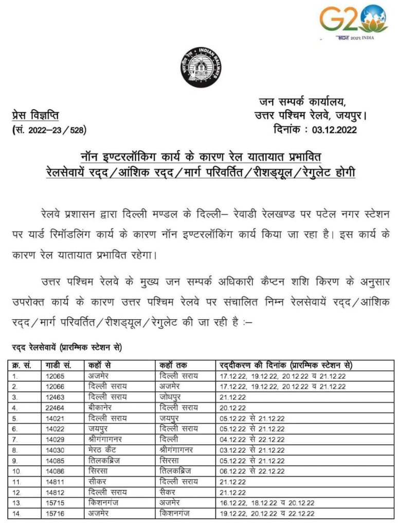 उत्तर रेलवे के दिल्ली मण्डल में, पटेलनगर स्टेशन पर रेलवे का यार्ड रिमॉडलिंग कार्य हेतु ब्लॉक लिया जा रहा है। दिल्ली से रेवाड़ी के बीच की बहुतांश गाड़ियाँ इससे बाधित होंगी। इस संदर्भ में उत्तर पश्चिम रेल के मुख्यालय से जारी यह परिपत्र देख लीजिए,