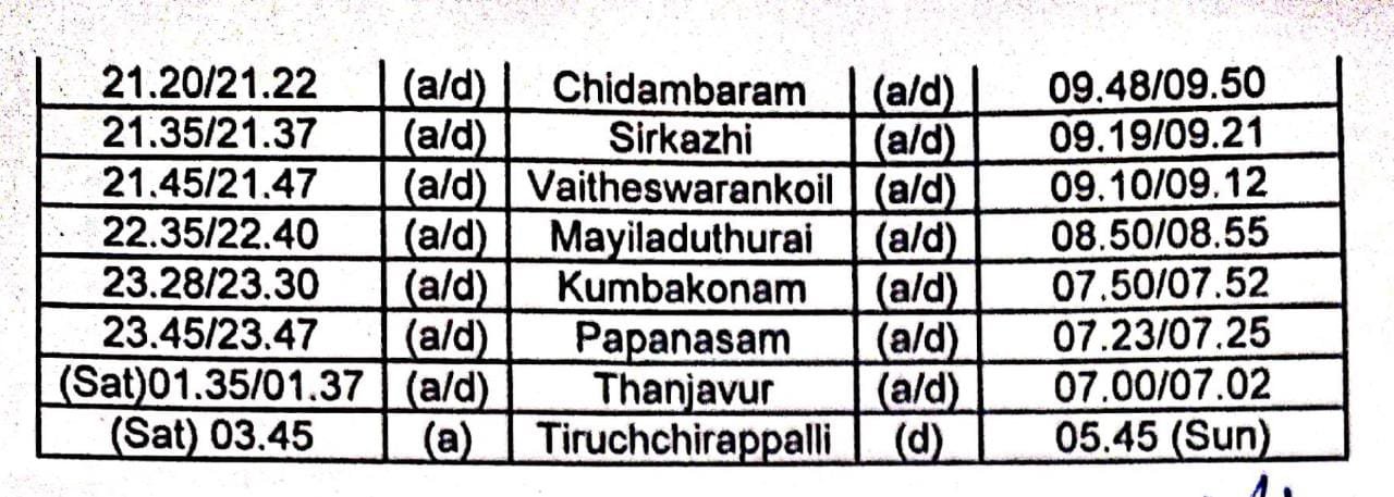 09419 अहमदाबाद तिरुचिरापल्ली विशेष दिनांक 22 दिसम्बर से 26 जनवरी तक प्रत्येक गुरुवार को चलेंगी और वापसी में 09420 तिरुचिरापल्ली अहमदाबाद विशेष दिनांक 25 दिसम्बर से 29 जनवरी तक प्रत्येक रविवार को चलेंगी। गाड़ी की डिब्बा संरचना 1 वातानुकूल टू टियर, 5 वातानुकूल थ्री टियर, 12 स्लीपर, 4 द्वितीय श्रेणी अनारक्षित और 2 एसएलआर ऐसे कुल 24 कोच रहेंगे। यात्रीगण ध्यान रहें गाड़ी का 1.3 गुना ज्यादा रहेगा, साथ ही विशेष गाड़ियोंके नियमानुसार ‘डिस्टेंस रिस्ट्रिक्शन’ भी लागू रहेगा। समयसारणी निम्नलिखित है।