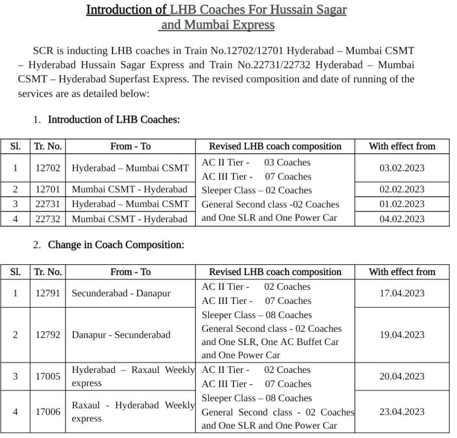 वहीं परिपत्रक की मद 2. देखिए, 12791/92 सिकंदराबाद दानापुर सिकंदराबाद प्रतिदिन और 17005/06 हैदराबाद रक्सौल हैदराबाद साप्ताहिक एक्सप्रेस की कोच संरचना का भी LHB मानकीकरण अप्रैल 2023 से करने की बात बताई गई है। यहॉं विषेश बात यह है, इनकी ग़ैरवातानुकूल या वातानुकूल कोचोंकी संख्या में कोई खासा बदलाव नही किया गया है। फिलहाल 9/10 स्लीपर कोच के साथ चलनेवाली यह गाड़ियाँ मानकीकरण के बाद 08 स्लीपर कोच और 02 द्वितीय श्रेणी कोच के साथ चलाई जायेंगी।