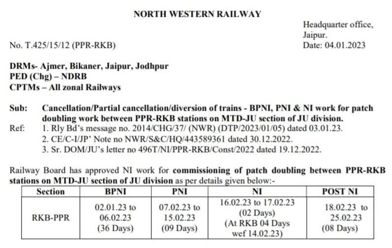 निम्नलिखित रेल ब्लॉक फरवरी माह में जोधपुर – मेड़तारोड खण्ड पर पीपाड़ रोड़ से राई का बाग़ पैलेस के बीच रहेगा।