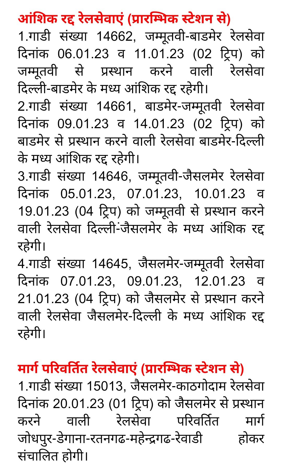 1: 14823/24 रेवाड़ी जोधपुर रेवाड़ी दिनांक 07 से 20 फरवरी तक रद्द