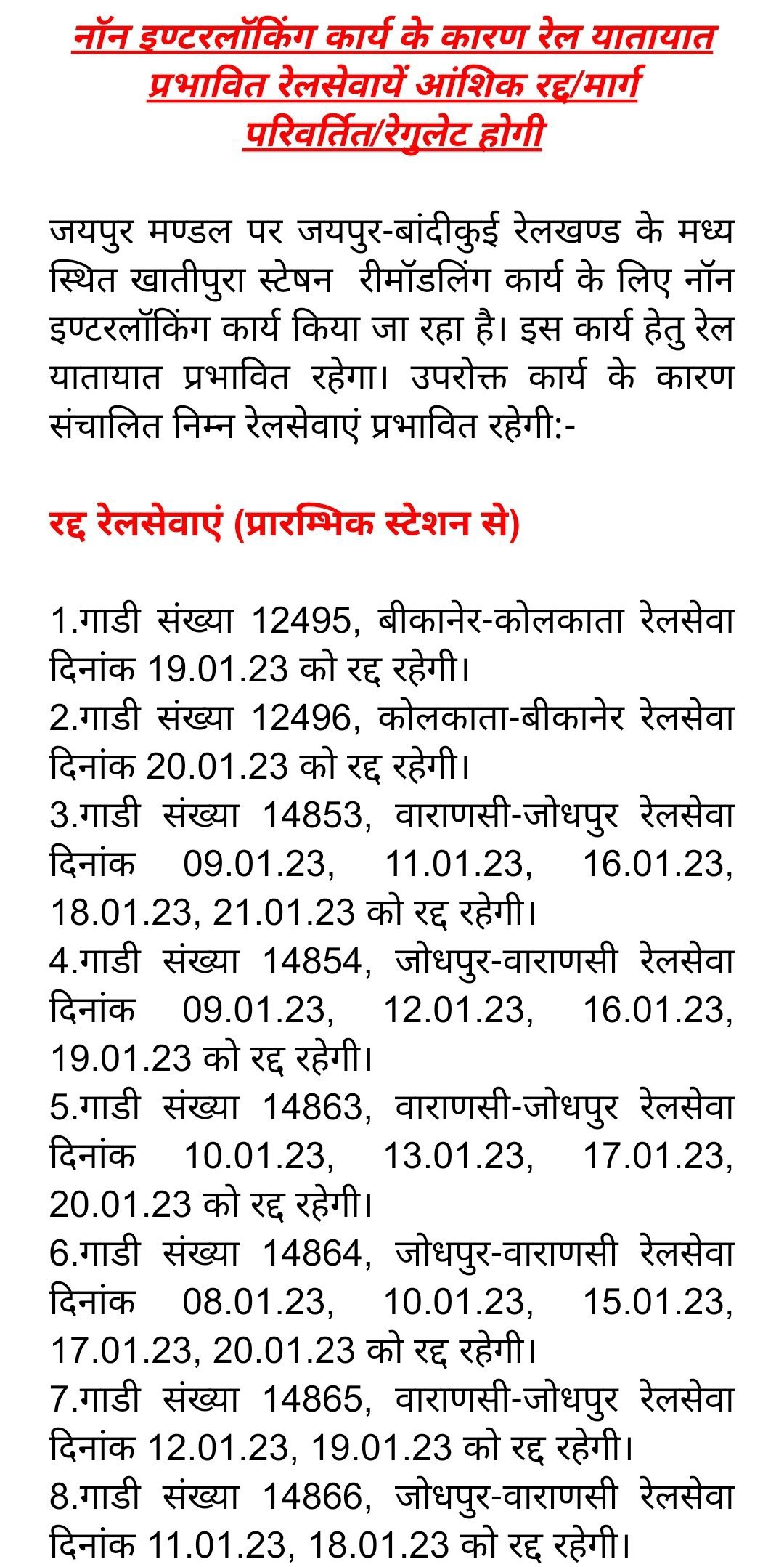 22421 दिल्ली सराय रोहिल्ला जोधपुर प्रतिदिन एक्सप्रेस दिनांक 07 से 18 फरवरी तक जोधपुर से डेगाना के बीच रद्द रहेगी। साथ ही 22422 जोधपुर दिल्ली सराय रोहिल्ला प्रतिदिन एक्सप्रेस दिनांक 08 से 19 फरवरी तक जोधपुर से डेगाना के बीच रद्द रहेगी।