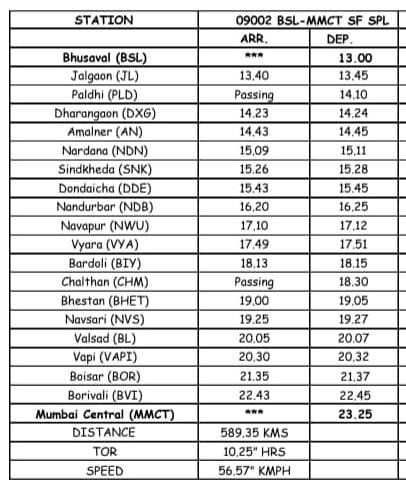 09002 उद्धाटन विशेष गाड़ी 09 जनवरी को भुसावल से मुम्बई के लिए चलेगी। उसकी एकल उद्धाटन फेरे की समयसारणी निम्नलिखित है।