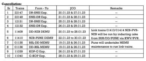 13) 12221 पुणे हावडा वातानुकूल दुरंतो एक्सप्रेस JCO 28 जनवरी, अपने प्रारम्भिक स्टेशन पुणे से ही परावर्तित मार्ग कर्जत, पनवेल, कल्याण होते हुए मनमाड पहुंचेगी। ऐसी अवस्था मे उक्त JCO की गाड़ी अपने नियमित स्टॉपेज दौंड कॉर्ड स्टेशनको बगैर छुए मनमाड़ पहुंचेगी और आगे नियमित मार्ग से हावडा को जाएगी।