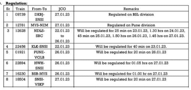 5) 12628 नई दिल्ली बेंगलुरू कर्नाटक एक्सप्रेस JCO 27 जनवरी, को नई दिल्ली से निकल नियमित मार्ग से मनमाड़ तक आएगी और आगे अपने परावर्तित मार्ग इगतपुरी, कल्याण, पनवेल, कर्जत, पुणे होते हुए दौंड पहुचेगी और आगे अपने नियमित मार्ग से बेंगलुरु को जाएगी। ऐसी अवस्था मे उक्त JCO की गाड़ी अपने नियमित स्टॉपेज कोपरगाँव, बेलापुर, अहमदनगर स्टेशनको बगैर छुए दौंड पहुंचेगी।