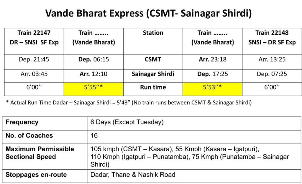 मुम्बई – साईंनगर शिर्डी – मुम्बई वन्देभारत एक्सप्रेस की प्रयोगात्मक समयसारणी