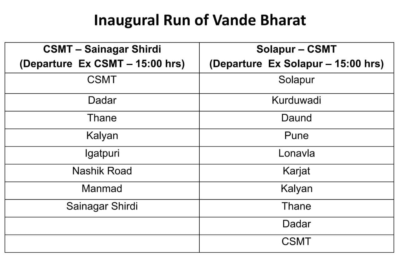 मुम्बई – साईंनगर शिर्डी उद्धाटन विशेष, दिनांक 10 फरवरी को दोपहर 15:00 बजे मुम्बई से एवं सोलापुर – मुम्बई उद्धाटन विशेष उसी दिन याने दिनांक 10 फरवरी को उसी समय दोपहर 15:00 बजे सोलापुर से मुम्बई की ओर निम्नलिखित ठहरावों के साथ रवाना की जाएगी।