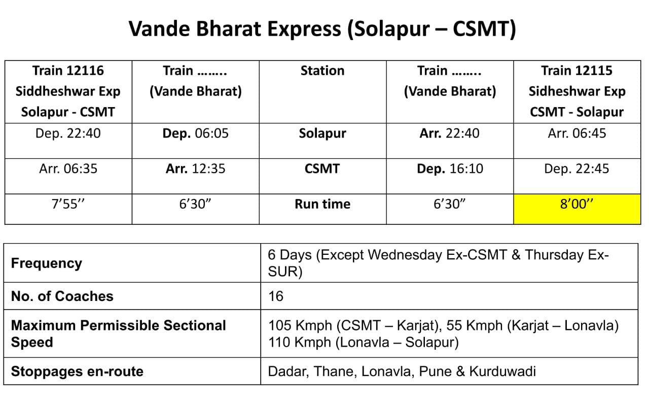 सोलापुर – मुम्बई – सोलापुर वन्देभारत एक्सप्रेस की प्रयोगात्मक समयसारणी