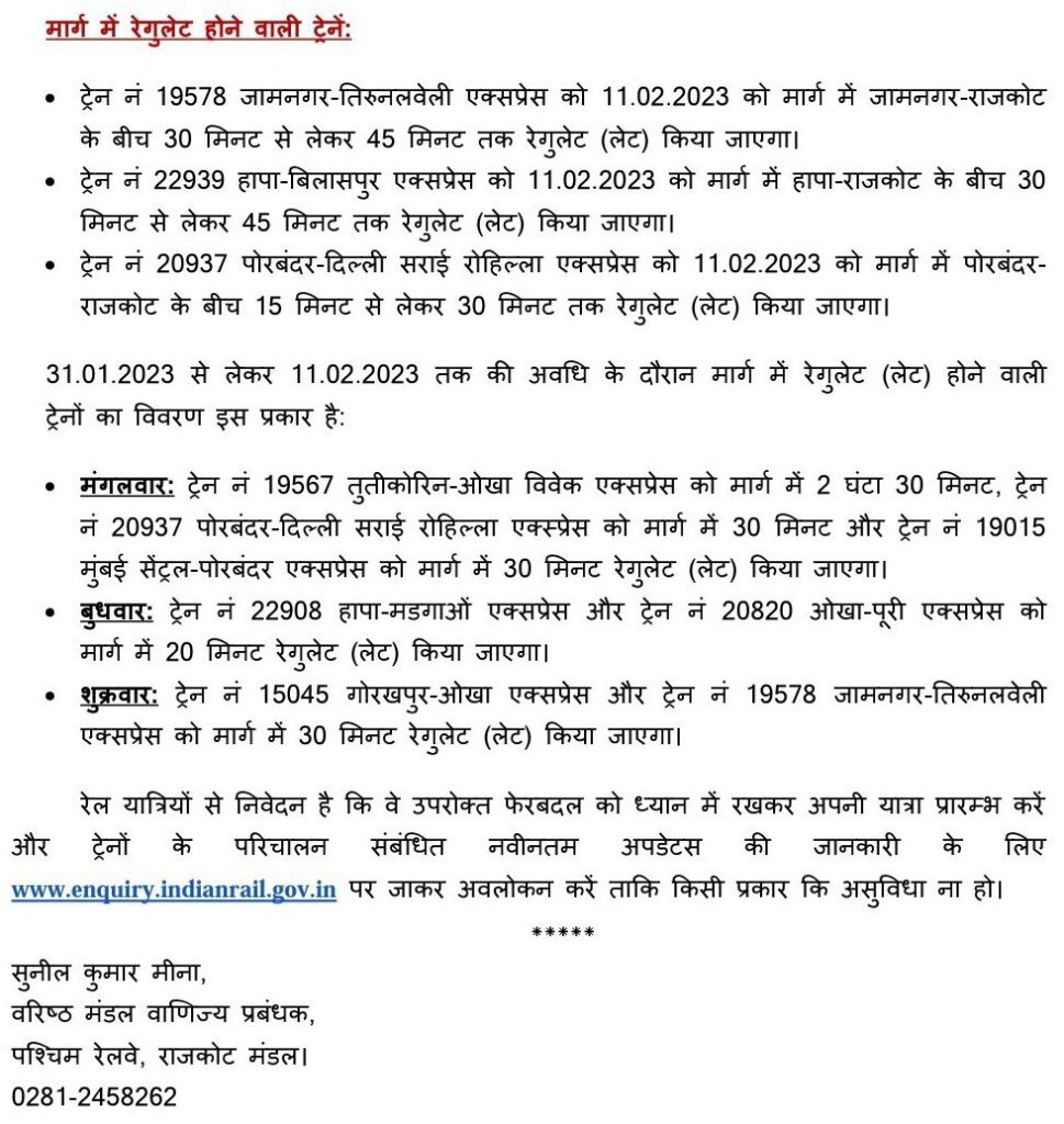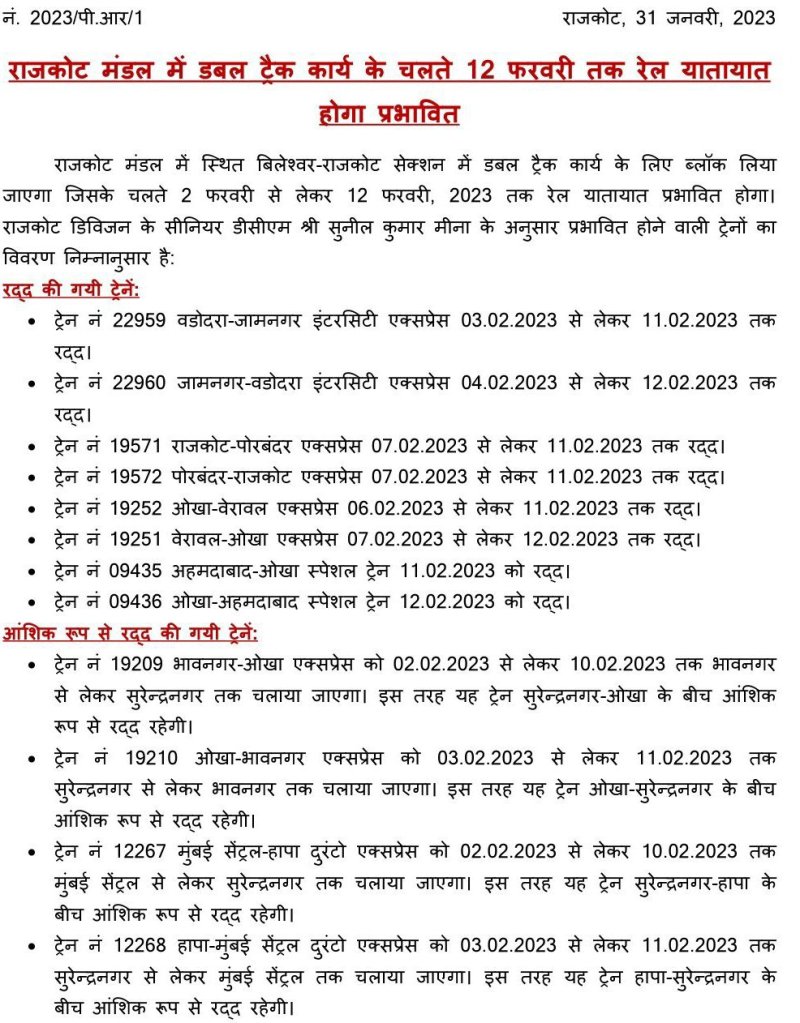Uncategorisedपश्चिम रेल WR के राजकोट मण्डल में रेल ब्लॉक 31st Jan 202331st Jan 2023 Rail Duniya 31 जानेवारी 2023, मंगलवार, माघ, शुक्ल पक्ष, दशमी, विक्रम संवत 2079 कृपया राजकोट मण्डल से जारी किया गया परिपत्रक देखें, Share this: Click to share on WhatsApp (Opens in new window) WhatsApp Click to share on X (Opens in new window) X Click to share on Facebook (Opens in new window) Facebook Click to share on Telegram (Opens in new window) Telegram Click to email a link to a friend (Opens in new window) Email Like Loading... Related Published by Rail Duniya Rail Duniya is a magazine publishing all India train timings since 1988. View all posts by Rail Duniya