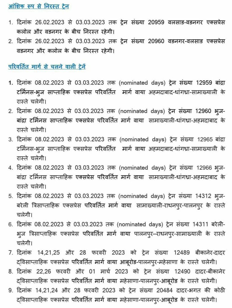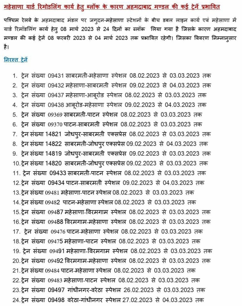 Uncategorisedपश्चिम रेल्वे WR के अहमदाबाद मण्डल में, मेहसाणा स्टेशन की यार्ड रिमॉडलिंग के चलते 8 फरवरी से 04 मार्च तक 24 गाड़ियाँ रद्द, 02 गाड़ियाँ आंशिक रद्द और 16 गाड़ियाँ मार्ग परिवर्तन कर चलेंगी। 8th Feb 20238th Feb 2023 Rail Duniya 08 फरवरी 2023, बुधवार, फाल्गुन, कृष्ण पक्ष, तृतीया, विक्रम संवत 2079 Share this: Click to share on WhatsApp (Opens in new window) WhatsApp Click to share on X (Opens in new window) X Click to share on Facebook (Opens in new window) Facebook Click to share on Telegram (Opens in new window) Telegram Click to email a link to a friend (Opens in new window) Email Like Loading... Related Published by Rail Duniya Rail Duniya is a magazine publishing all India train timings since 1988. View all posts by Rail Duniya
