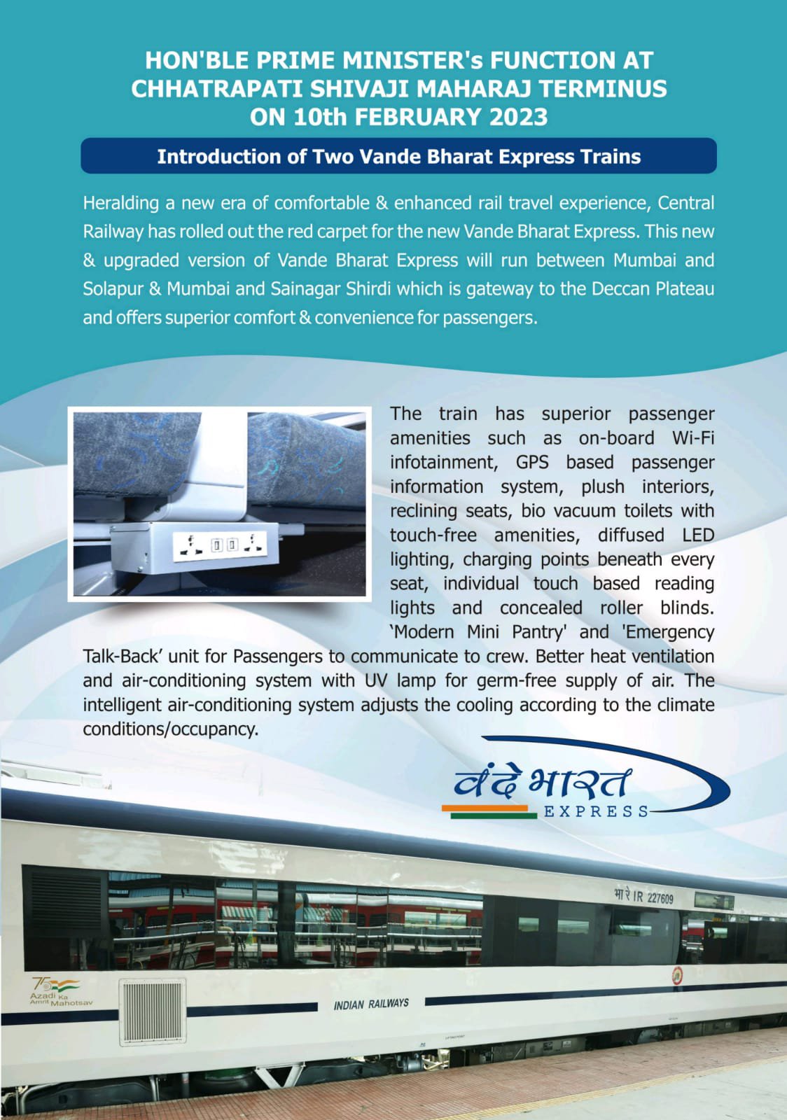 मध्य रेल CR की दो वन्देभारत गाड़ियोंका उद्धाटन दिनांक 10 फरवरी को प्रधानमंत्री नरेंद्र मोदी करने जा रहे है। यज्ञपी यह दोनों गाड़ियाँ सप्ताह में 6 दिन चलनेवाली है।