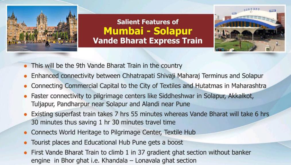 22225/22226 मुम्बई छत्रपति शिवाजी महाराज टर्मिनस – सोलापुर – मुम्बई छत्रपति शिवाजी महाराज टर्मिनस सप्ताह में 6 दिन चलेगी। मुम्बई से बुधवार और सोलापुर से गुरुवार को नही चलेगी।