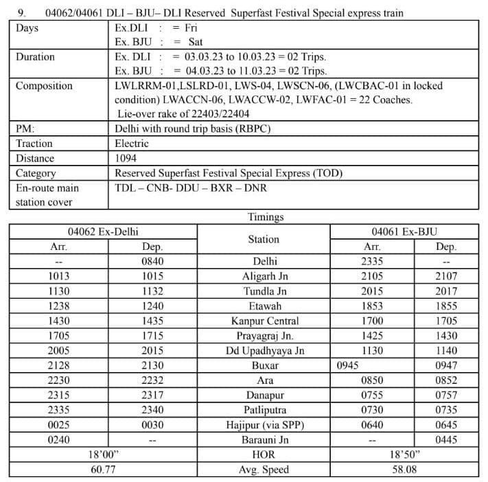 04062/61 दिल्ली – बरौनी – दिल्ली साप्ताहिक सुपरफास्ट विशेष