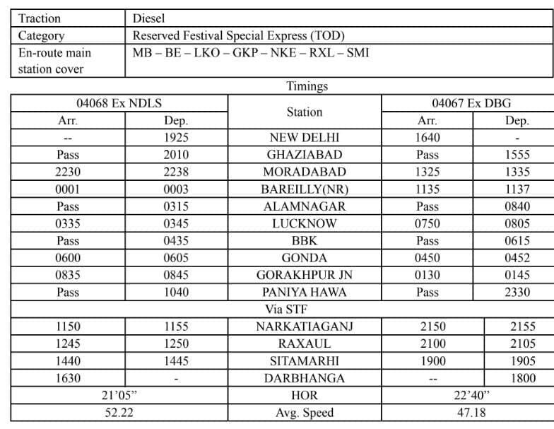 04068/67 नई दिल्ली – दरभंगा – नई दिल्ली द्विसाप्ताहिक विशेष