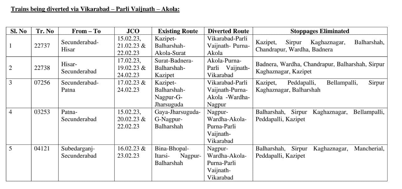 22737 सिकंदराबाद हिसार द्विसाप्ताहिक एक्सप्रेस दिनांक 15, 21 एवं 22 फरवरी को और 22738 हिसार सिकंदराबाद द्विसाप्ताहिक एक्सप्रेस दिनांक 17, 19 एवं 24 फरवरी अपने नियमित मार्ग काजीपेट, सिरपुर कागजनगर, बल्हारशाह, चंद्रपूर, वर्धा, बड़नेरा के स्थान पर विकाराबाद, परली, अकोला होकर चलेगी। 07256 सिकंदराबाद पटना साप्ताहिक विशेष दिनांक 17 एवं 24 फरवरी, 03253 पटना सिकंदराबाद द्विसाप्ताहिक विशेष दिनांक 15, 20 एवं 22 फरवरी को, 04121 सफदरगंज सिकंदराबाद साप्ताहिक विशेष दिनांक 16 एवं 23 फरवरी को अपने नियमित मार्ग काजीपेट, पेड़पल्ली, बेलमपल्ली, सिरपुर कागजनगर, बल्हारशाह के जगह नागपूर, वर्धा, अकोला, पूर्णा, परली विकाराबाद होकर चलेगी।