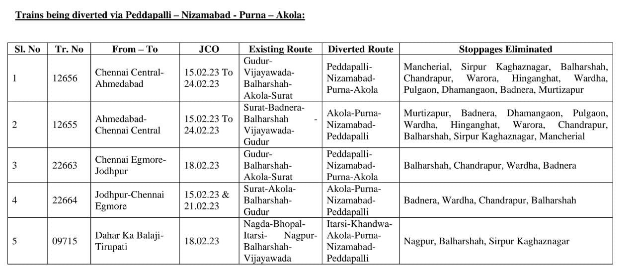 12656/55 चेन्नई सेंट्रल अहमदाबाद चेन्नई सेंट्रल नवजीवन प्रतिदिन एक्स्प्रेस jco दिनांक 15 फरवरी से 24 फरवरी तक अपने नियमित मार्ग मंचारियाल, सिरपुर कागजनगर, बल्हारशाह, चंद्रपूर, वरोरा, हिंगनघाट, वर्धा, पुलगाव, धामनगाव, बड़नेरा के स्थान पर पेडापल्ली, निजामाबाद, पूर्णा, अकोला होकर चलेगी। 22663 चेन्नई एग्मोर जोधपुर साप्ताहिक एक्सप्रेस jco 18 फरवरी और 22664 जोधपुर चेन्नई एग्मोर साप्ताहिक एक्सप्रेस jco 15 एवं 21 फरवरी को अपने नियमित मार्ग बल्हारशाह, चंद्रपूर, वर्धा, बड़नेरा के स्थान पर पेडापल्ली, निजामाबाद, पूर्णा, अकोला होकर चलेगी। 09715 ढाहर का बालाजी तिरुपति साप्ताहिक विशेष जेसीओ दिनांक 18 फरवरी को अपने नियमित मार्ग इटारसी, नागपूर, बल्हारशाह, सिरपुर कागजनगर के स्थान पर इटारसी, खंडवा, अकोला, पूर्णा, निजामाबाद होकर चलेगी।