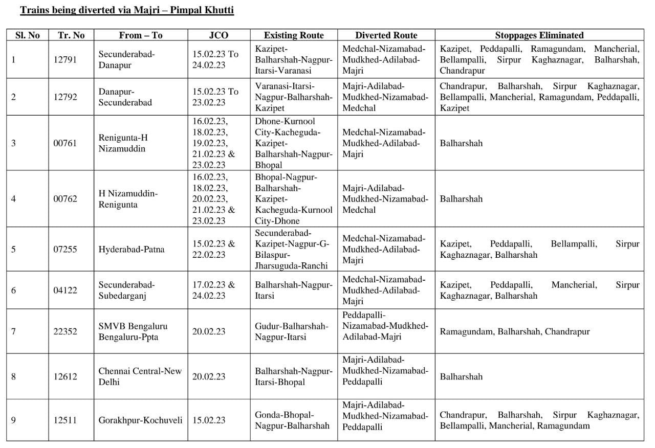09 गाडियाँ उपरोक्त मार्ग से परावर्तित होकर चलने वाली है जिसमे प्रमुख 12791/92 सिकंदराबाद दानापुर सिकंदराबाद प्रतिदिन एक्सप्रेस jco दिनांक 15 फरवरी से 24 फरवरी तक अपने नियमित मार्ग काजीपेट, मंचारियाल,, पेडापल्ली, रामागुन्डम, सिरपुर कागजनगर, बल्हारशाह, चंद्रपूर के स्थान पर मेडचाल, निजामाबाद, मुदखेड़, अदिलाबाद माजरी होकर चलेगी।
